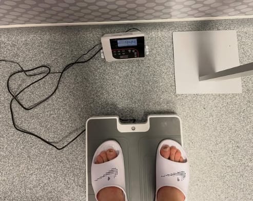 På Instagram har norrmannen lagt upp en bild när han står på en våg, som visar 94,4 kilogram.